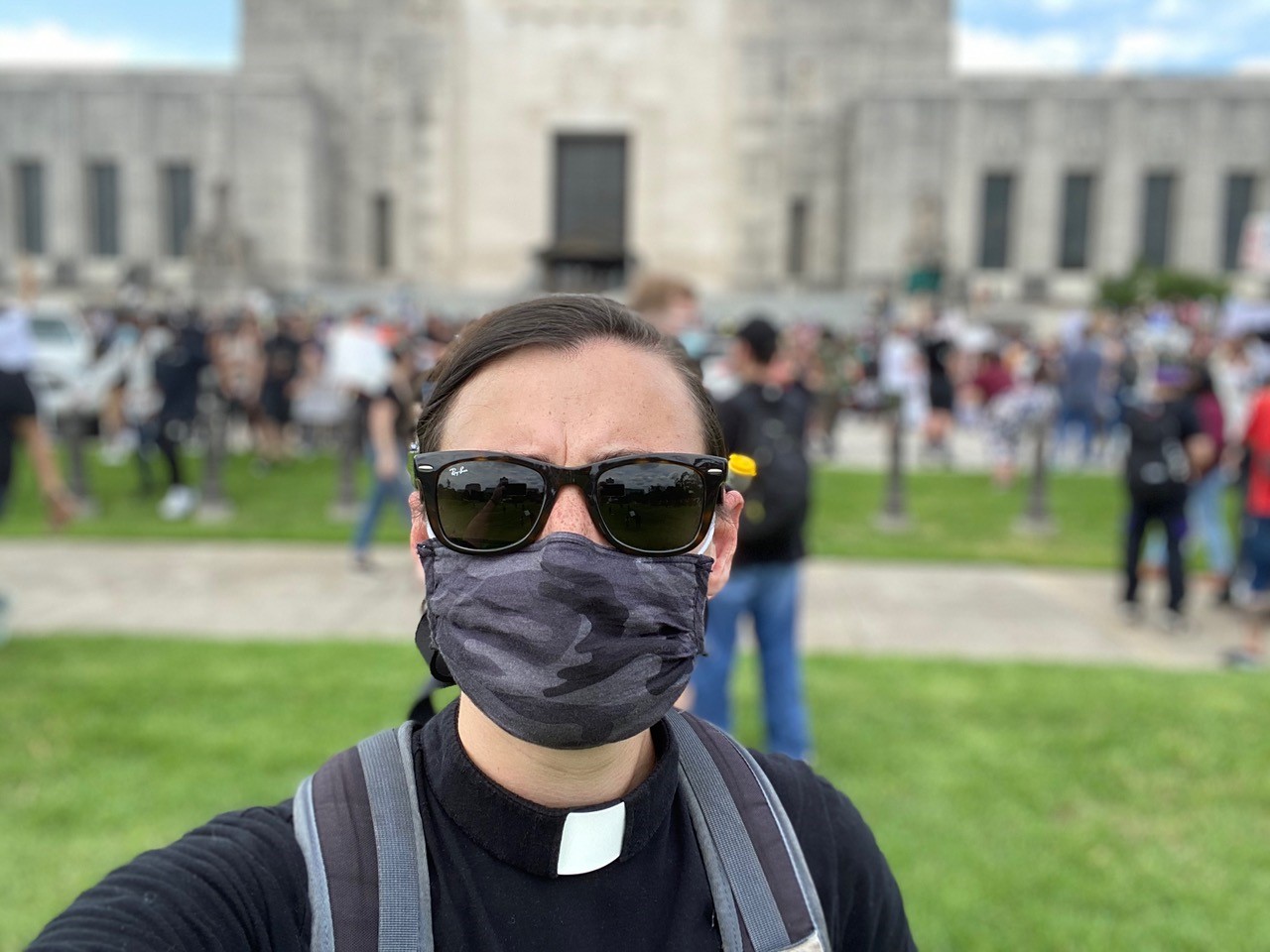 Así que, el 31 de mayo me puse mi cuello clerical, una máscara, y me dirigí a centro de Baton Rouge. Llegué preparada en caso de que hubiera bombas lacrimógenas y con mi guía de ACLU para la protesta. Fui con mi esposo y me preparé a mostrar mi presencia como clero en un lugar de dolor y anhelo.
